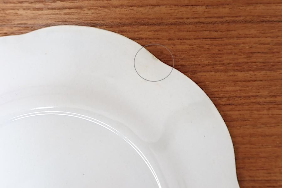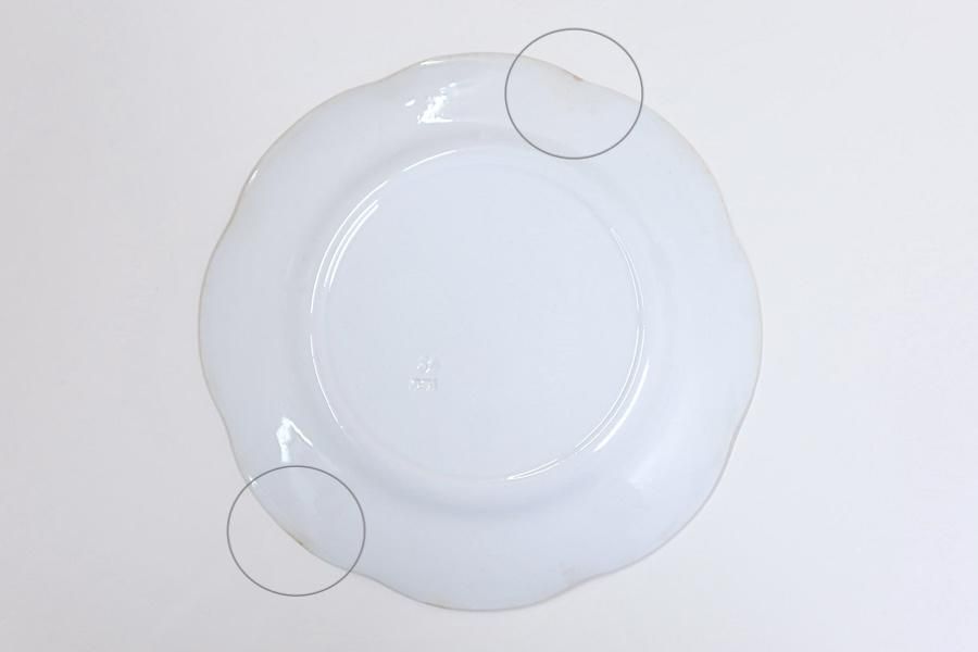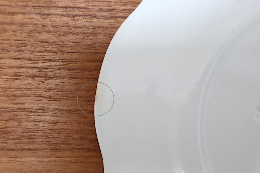 表面の赤色部分のはがれ、カトラリースクラッチ、裏面のフチに、釉薬がはがれ、色素沈着した箇所が見られます。