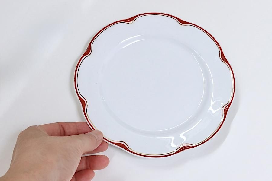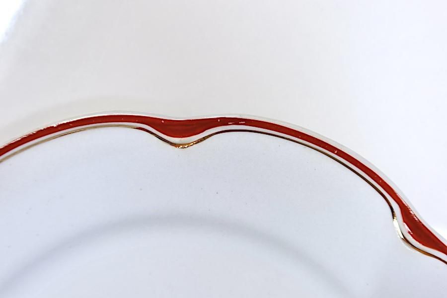 輪花模様のフチ、白地に赤と金色が塗られています。他に、紺色+銀色、金色単色などがあり、年代もバックスタンプも異なり、諸説あるシリーズです。こちらは、直径18cmのプレート。ロゴは消えていて、34/BB10と刻まれています。1934年製でしょうか。シリーズは、1917年頃から1930年代頃の短い期間に製造されたようです。