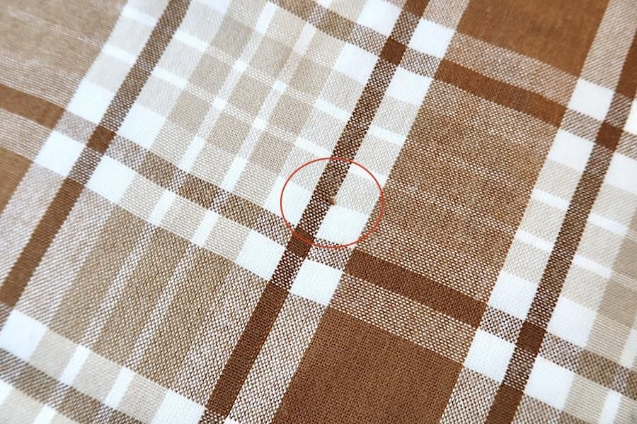 ウール混素材のチェックの生地。ほぼ正方形で、丸テーブルにも合わせやすい大きさです。2辺が縫われています。