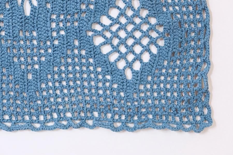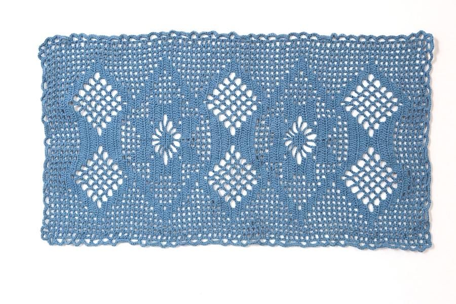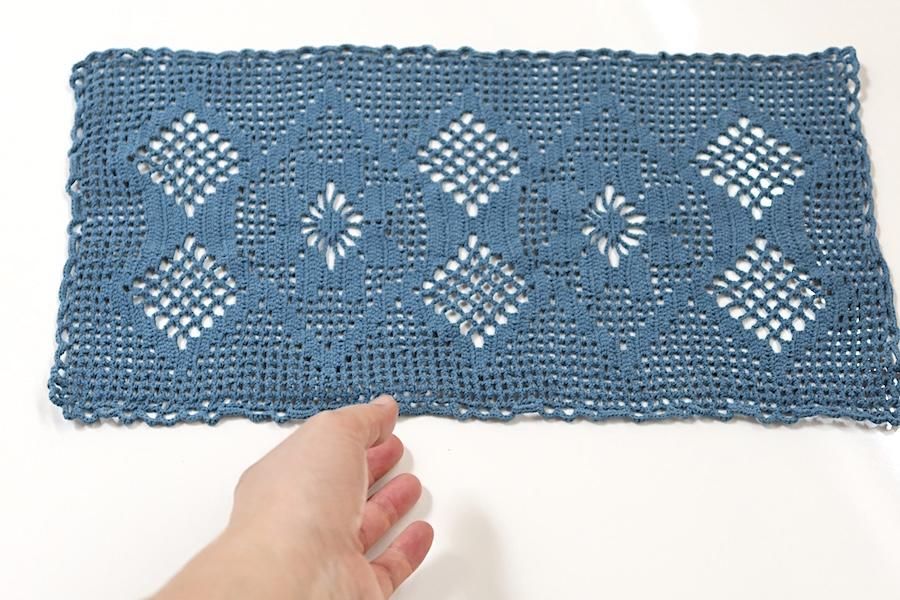 モチーフを編んで作られた、長方形タイプです。くすんだブルーカラーです。