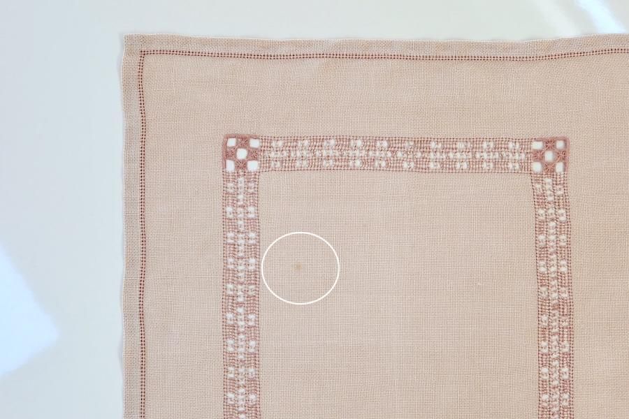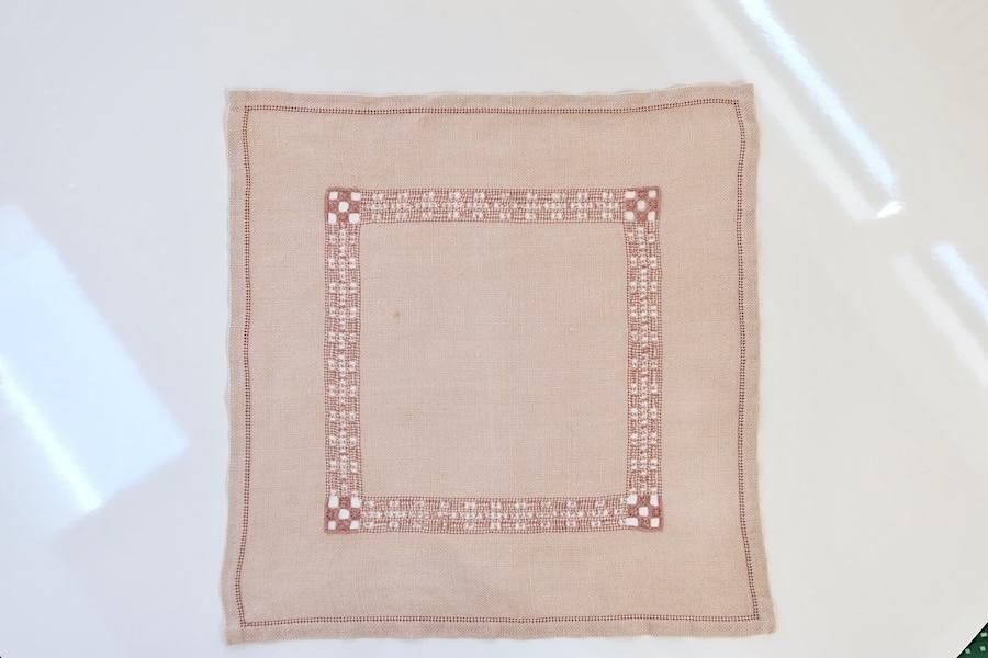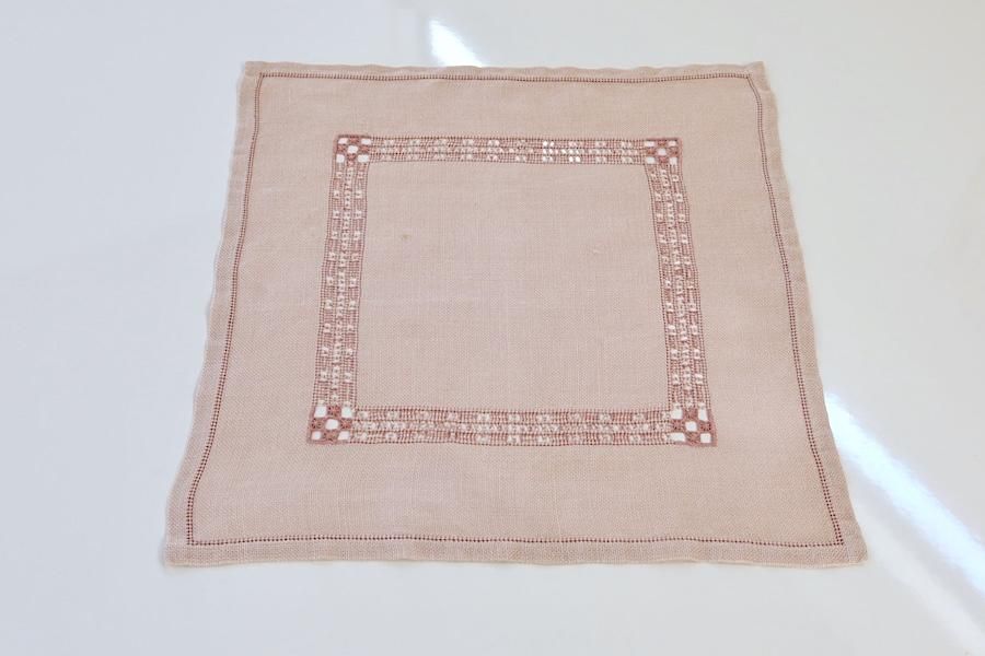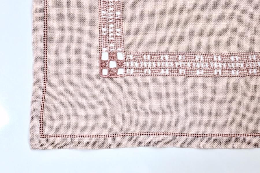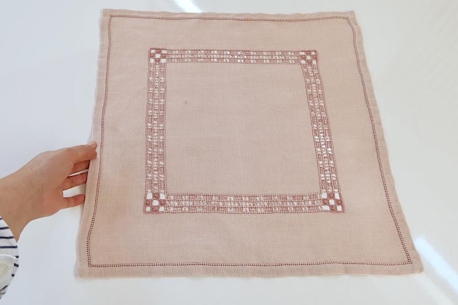 ピンク色のリネンに、ハーダンガー刺繍(透かし模様)が入れられた、正方形タイプです。