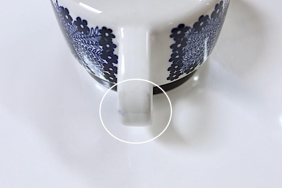 カップ:外側のフチのラインの下(点)、ハンドル(にじみ)、外側側面下部、底面高台に、ペイントの付着が見られます。