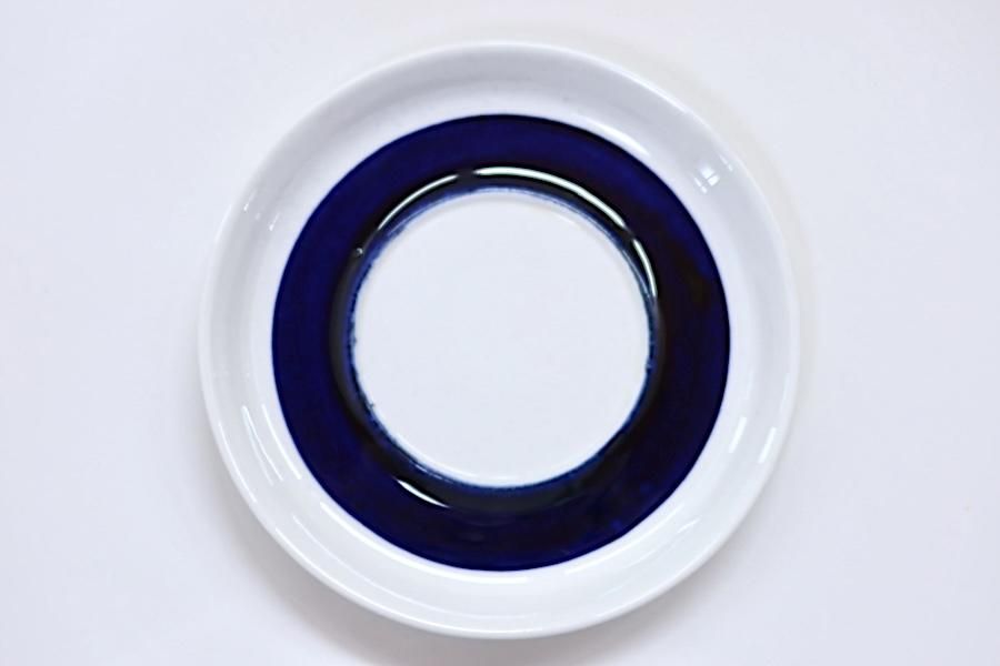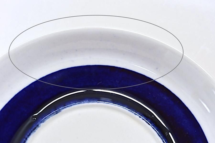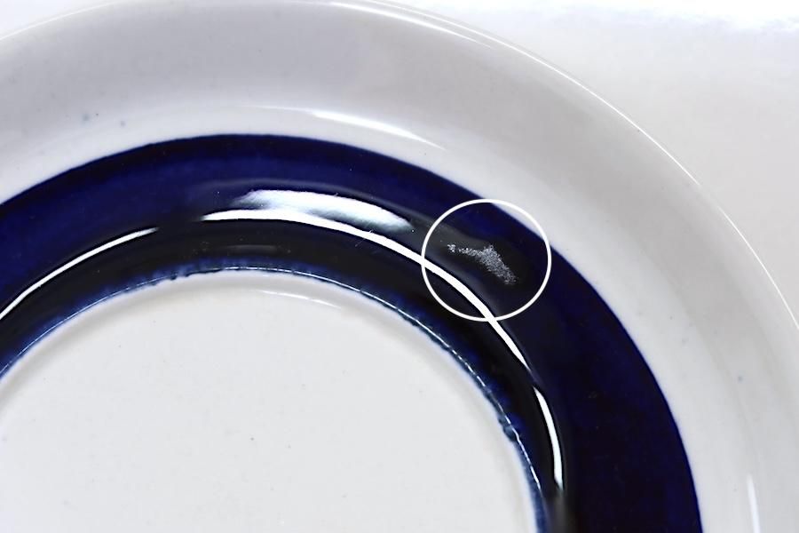 ソーサー:表面中央に、スレがあります。表面のラインの外側に、うっすらとした点々のペイントの付着が見られます。三点支柱のあとは、目立たない程度です。釉薬のかすれ、にじみはハンドペイントの特徴です。