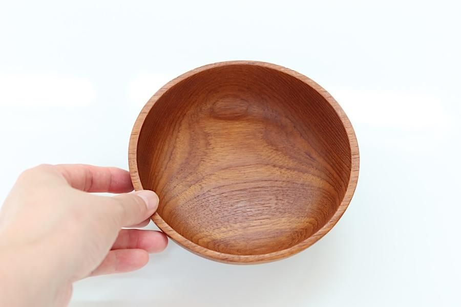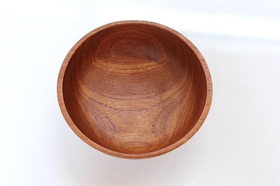 木を削り出して作られたチークのボウルです。シリアルボウルなどの小さめサイズ。メーカーが作るような正確さとは反対に、民芸品のような個体差があり、それが味になっています。