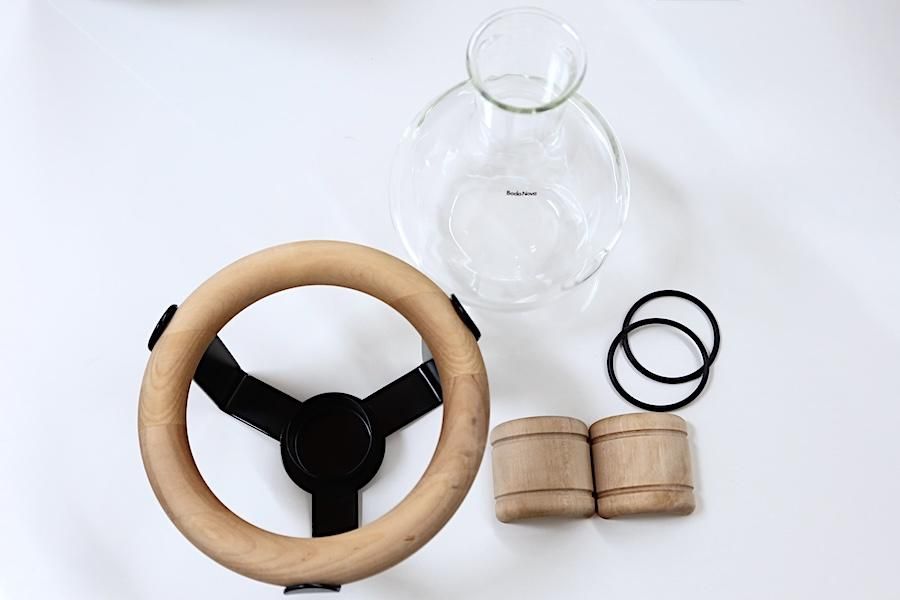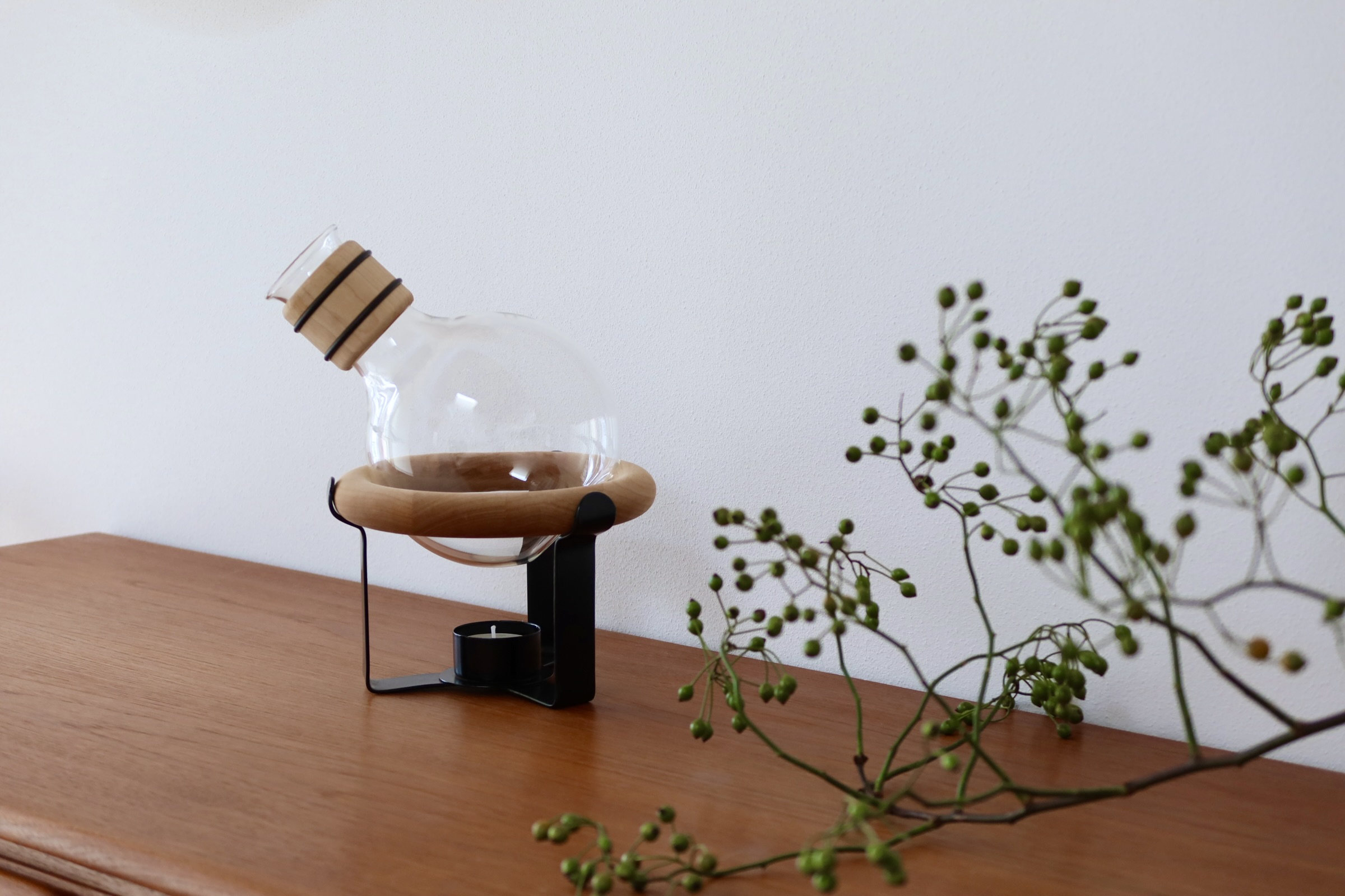 シナモンやカルダモン、はちみつなどを加えて温めたグロッグなど、ホットワインを楽しむセットです。フラスコ型のデキャンタの注ぎ口には、取外し可能な木のカバーが付いていて、ガラスが熱くなっても握れるようになっています。ティーライトキャンドルを置ける鉄と木のリングが付いたウォーマーとセットです。