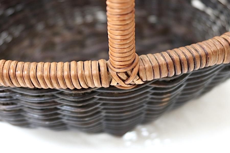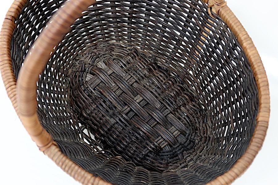 ハンドルがある、楕円形のほどよいサイズ。本体は黒に塗られていて、フチとハンドルはナチュラルです。