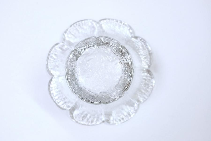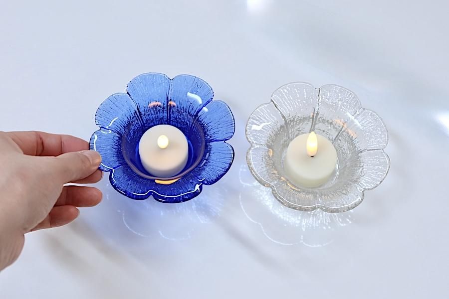 外側に、立体的な凹凸が施され、花びらがより自然に、魅力的に見えるデザインです。ティーキャンドルが入る、小さめサイズです。手作業で成形されているため、シンメトリーではないです。
