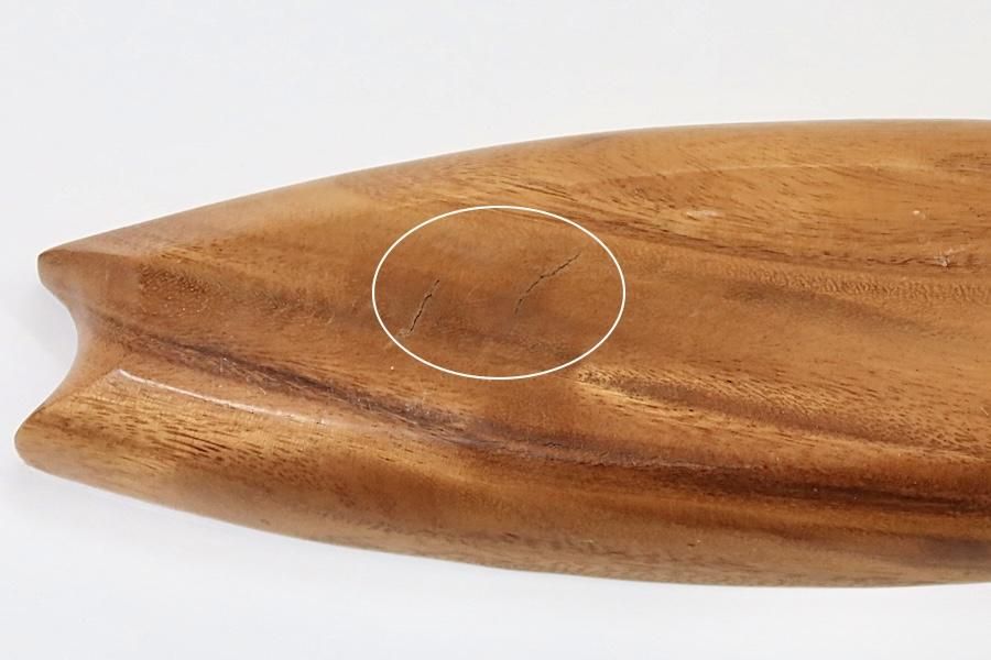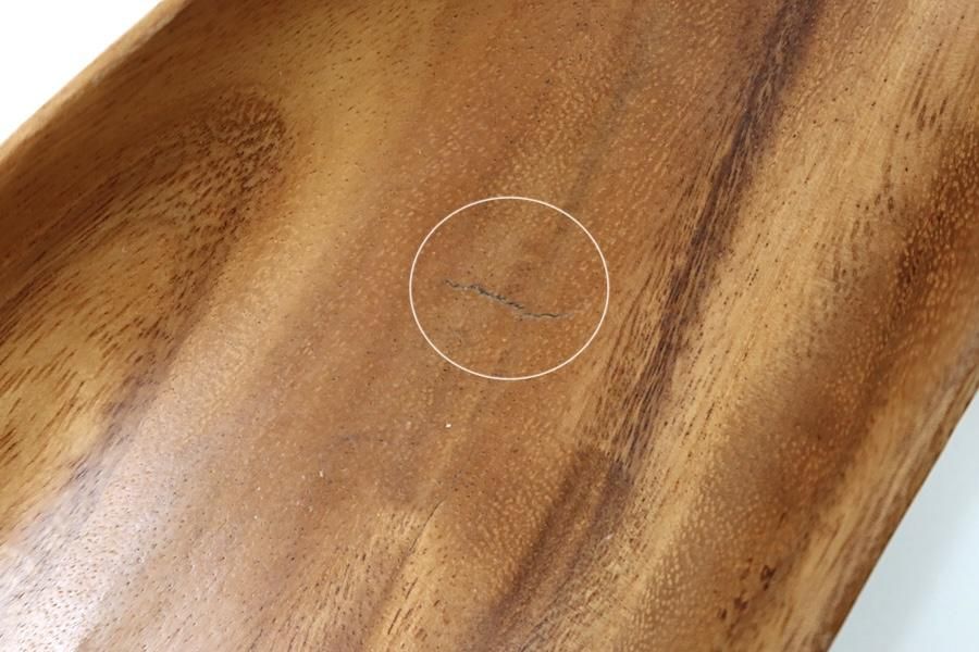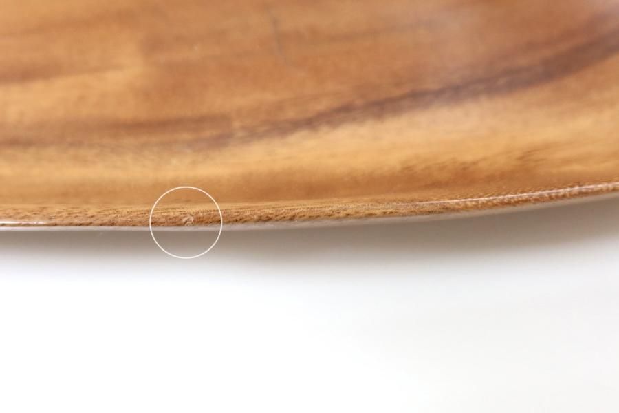 内側と外側底面に、木のシワのような線状のくぼみが見られます。厚みのある底のため、その部分から割れるようなものではありません。フチにごく浅い削れがあります。全体的に良好なコンディションです。