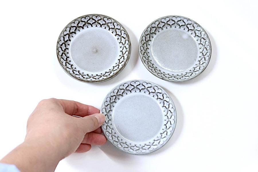 DANSKのお鍋のデザインで知られる、クイストゴーがデザインしています。グレーのベースに、並んだモチーフの上と下の段がハートになっています。こちらは、直径10cm弱の小皿です。