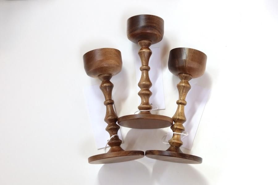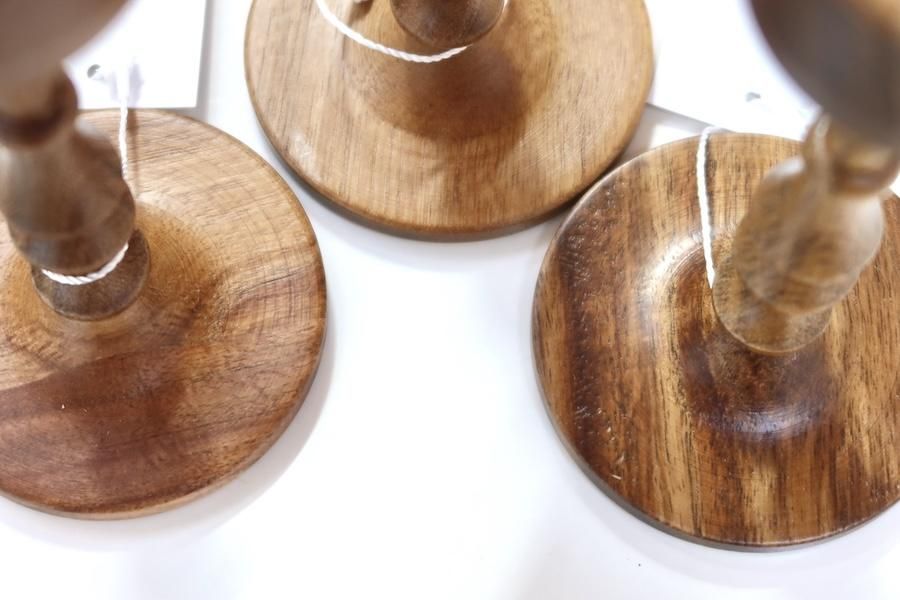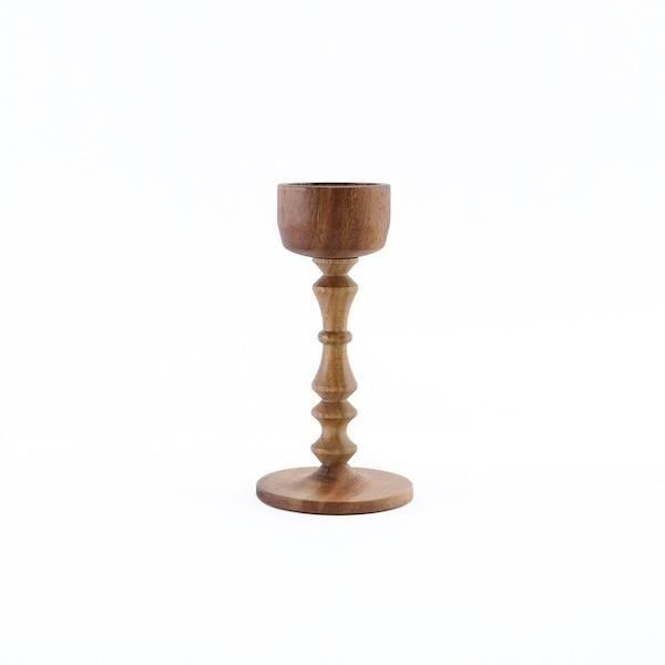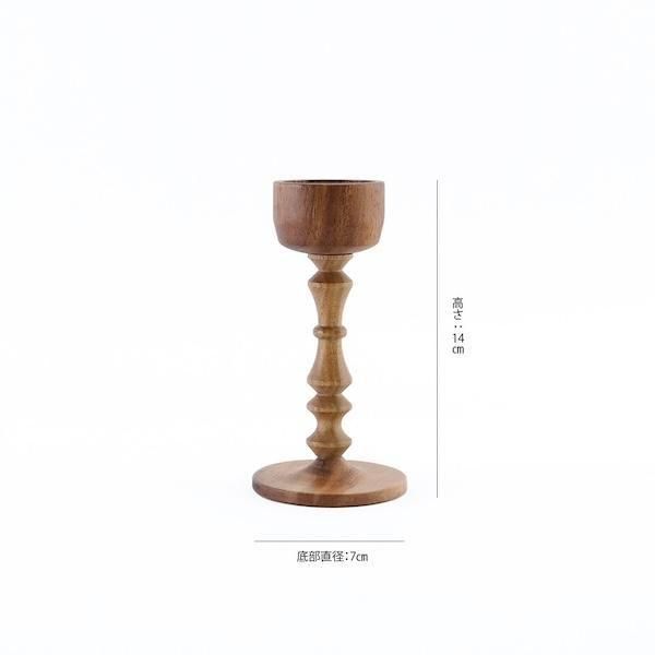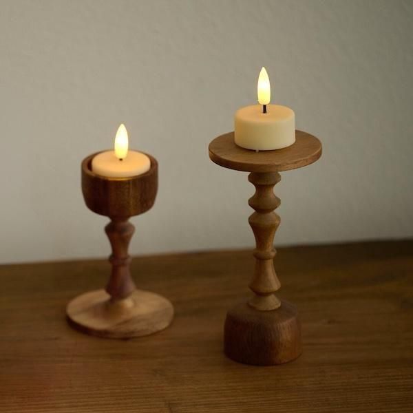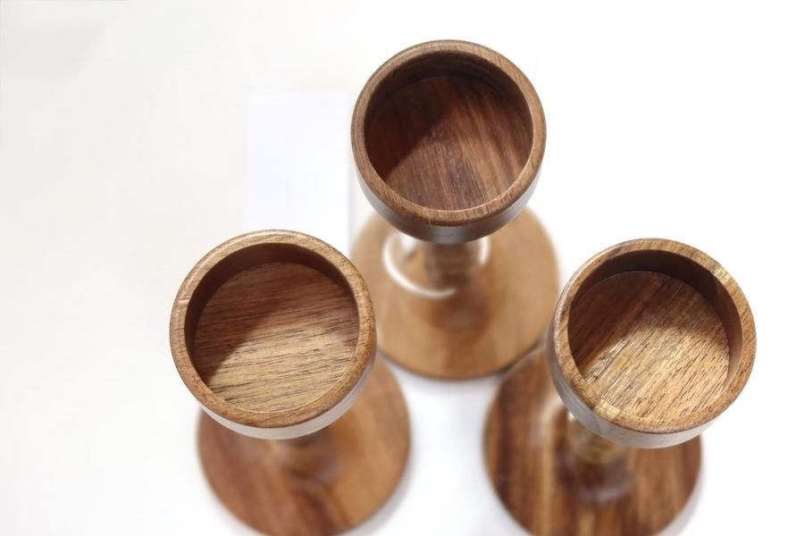 アカシアの木で作られたキャンドル置き。ティーライトキャンドルが収まるサイズです。逆さまにすると、底面が平らなため、大きめのキャンドル(LEDライトキャンドル/ボーティブなど)を置くこともできます。こちらは、2サイズ並んだ画像の背の高い方です。