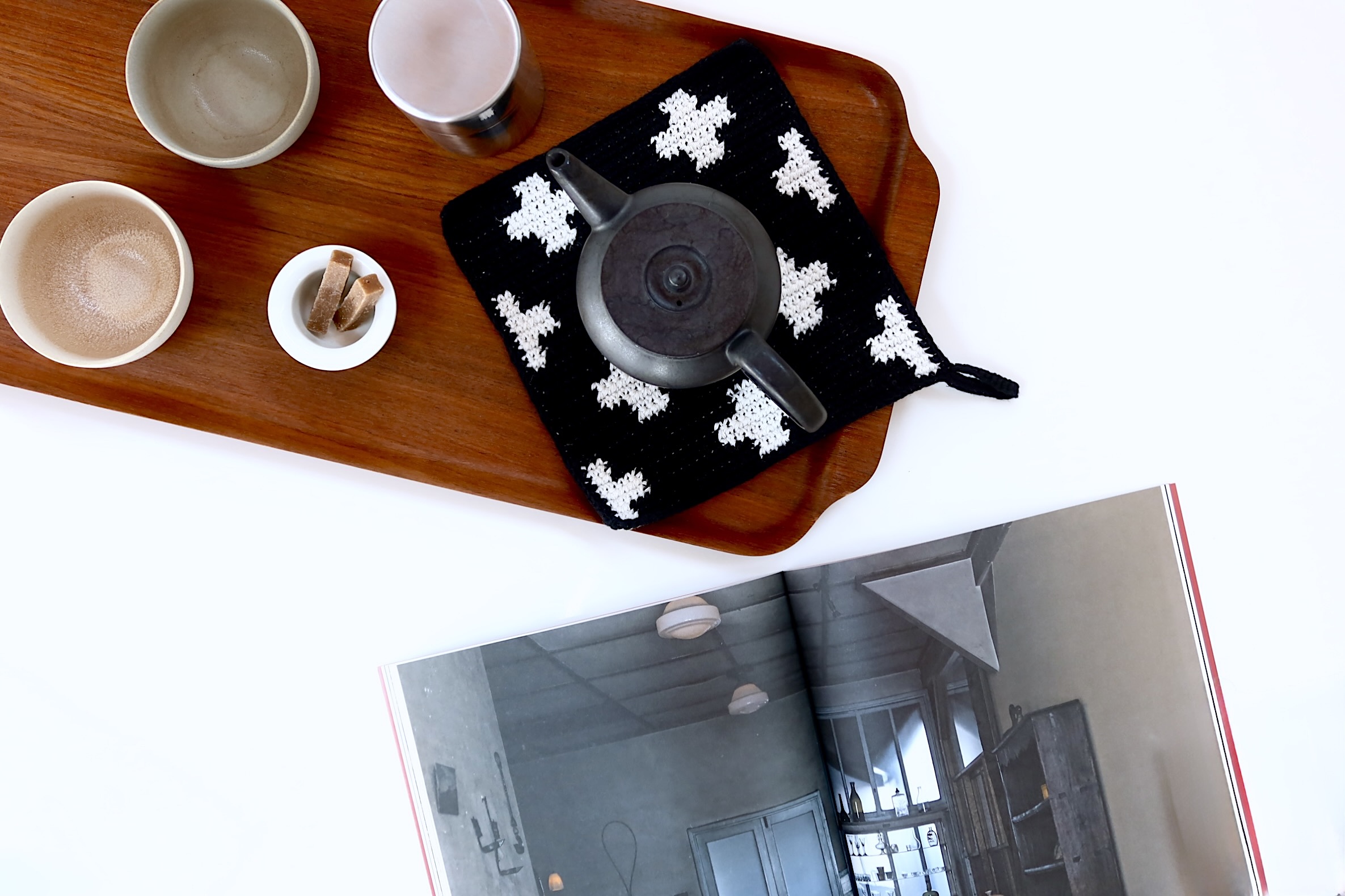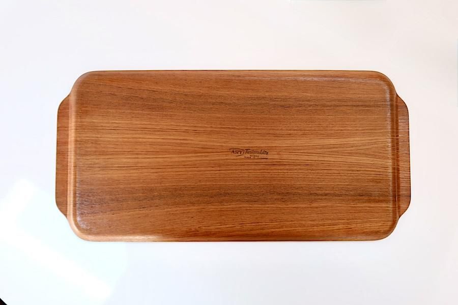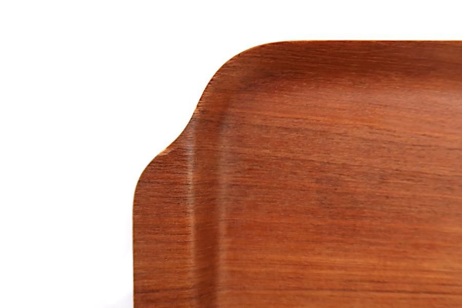 チーク材を薄くカットし、数枚を重ねてトレイの型にプレスする方式で作られたトレイです。いちばんの魅力は軽さですが、堅さもあるので丈夫です。こちらは、長方形にハンドルが付いたタイプです。