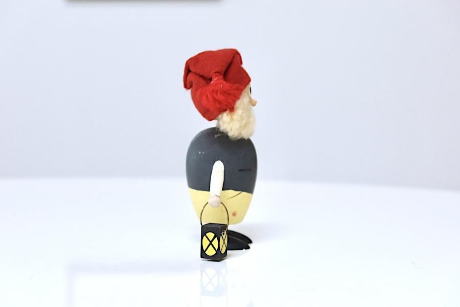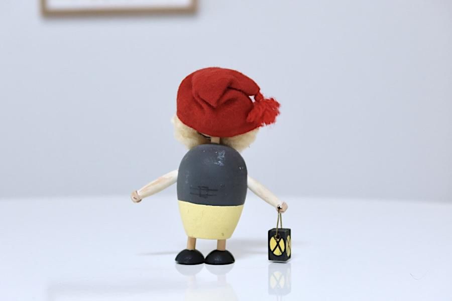 フェルトの帽子、毛糸のヒゲ、にっこりと微笑んだ口元の、木で作られたサンタクロース。ルドルフ(トナカイ)がいないせいか、灯りを自ら持っています。右側にカラダが傾いているのも、持ち慣れない灯りが、重いせいかもしれません...。