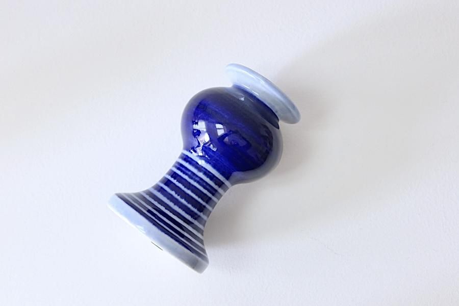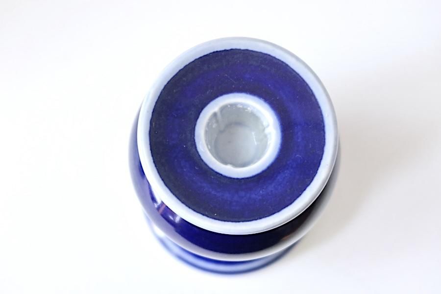 こちらは、マリン/Marinシリーズのキャンドルホルダーです。1992年に赤バージョンが制作されたあとに登場した青バージョン。成形もデコレーションも手作業で制作されているため、ラインが細いものや太いものなど、バリエーションがあり、また制作過程で生じるにじみなどの個性が楽しめる作品です。