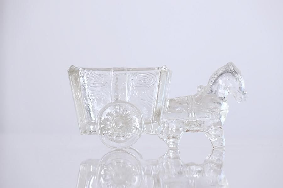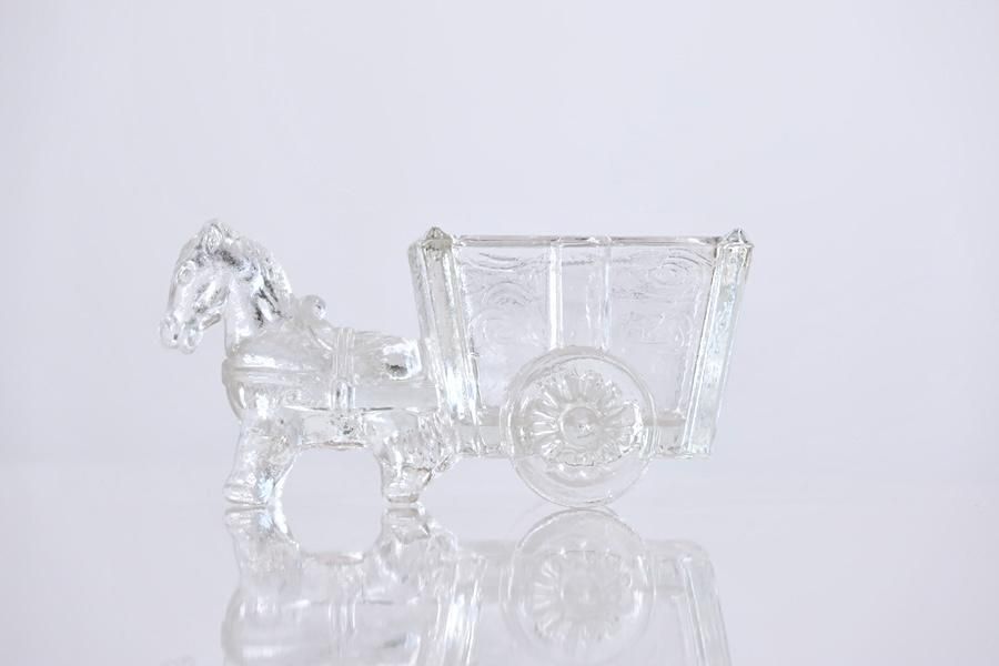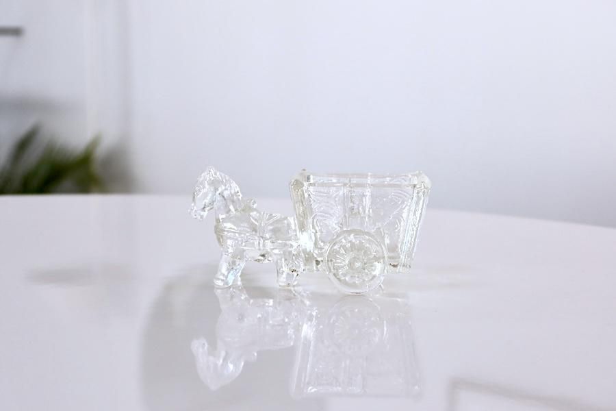 ダーラナホースのような馬が荷車を引いているデザインの、小さな置物。荷車部分には、アクセサリーなど小さなものを入れられます。
