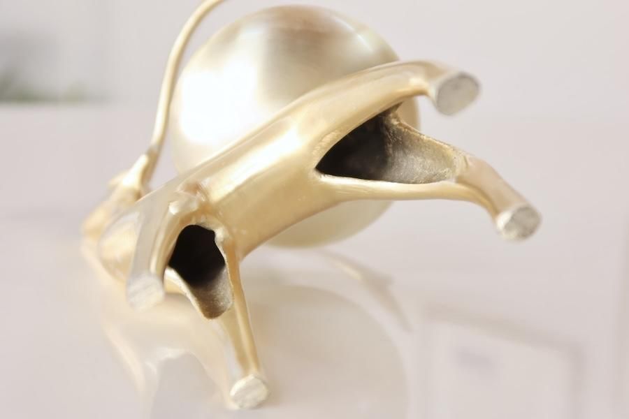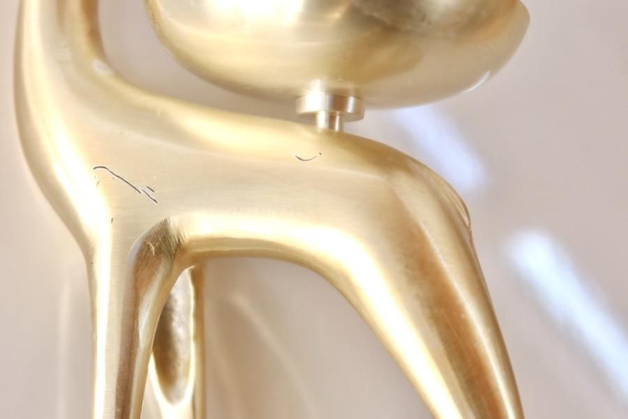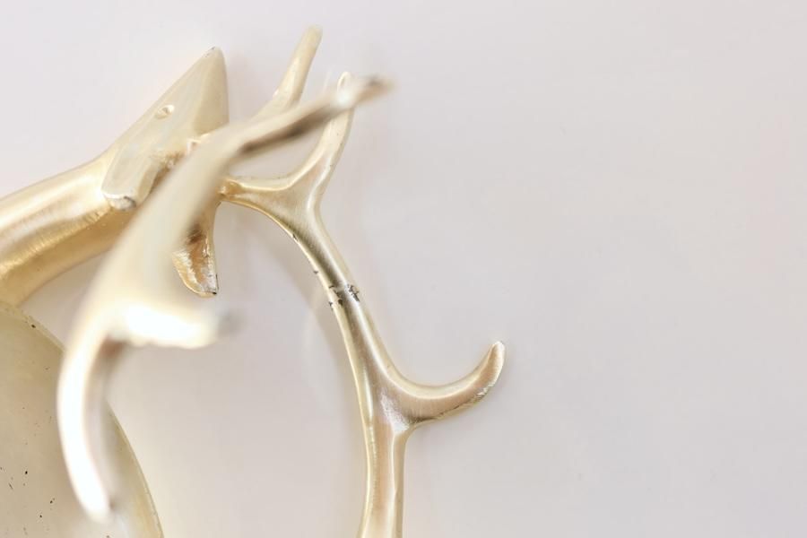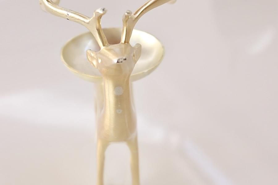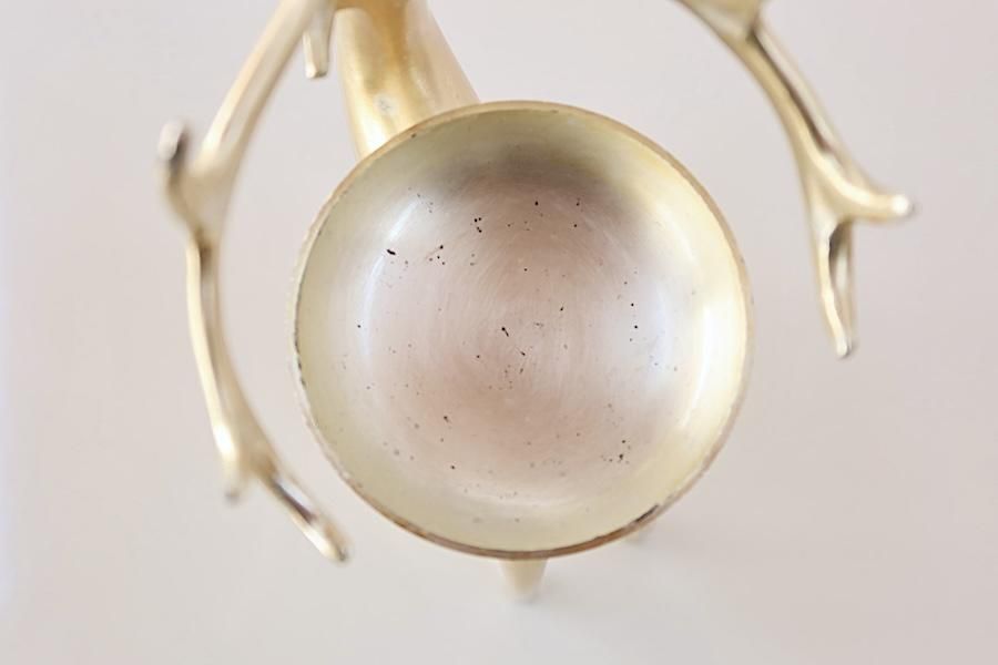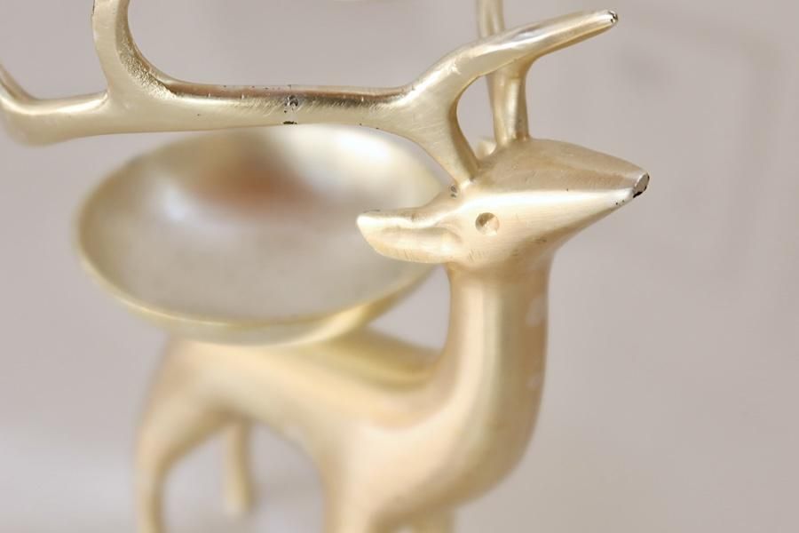 こちらは、現在も製造されているPENTIKの象徴的なプロダクト、トナカイのキャンドルホルダーです。寒さが厳しいラップランドの自然に暮らし、人々とも深く関わってきたトナカイ。こちらのトナカイも、立派な角(つの)があり、上を向いた姿が凛として美しい製品です。従来、真鍮にシルバーメッキを施した製品ですが、この個体は、ゴールドとシルバーのあいだのような色が塗られており、限定モデルとして発売されたものでした。次第に黒ずんでいくシルバーの個体とは異なり、明るい色がいまも保たれています。丸いキャンドル用の受け皿が付いています。小物置きとしても。